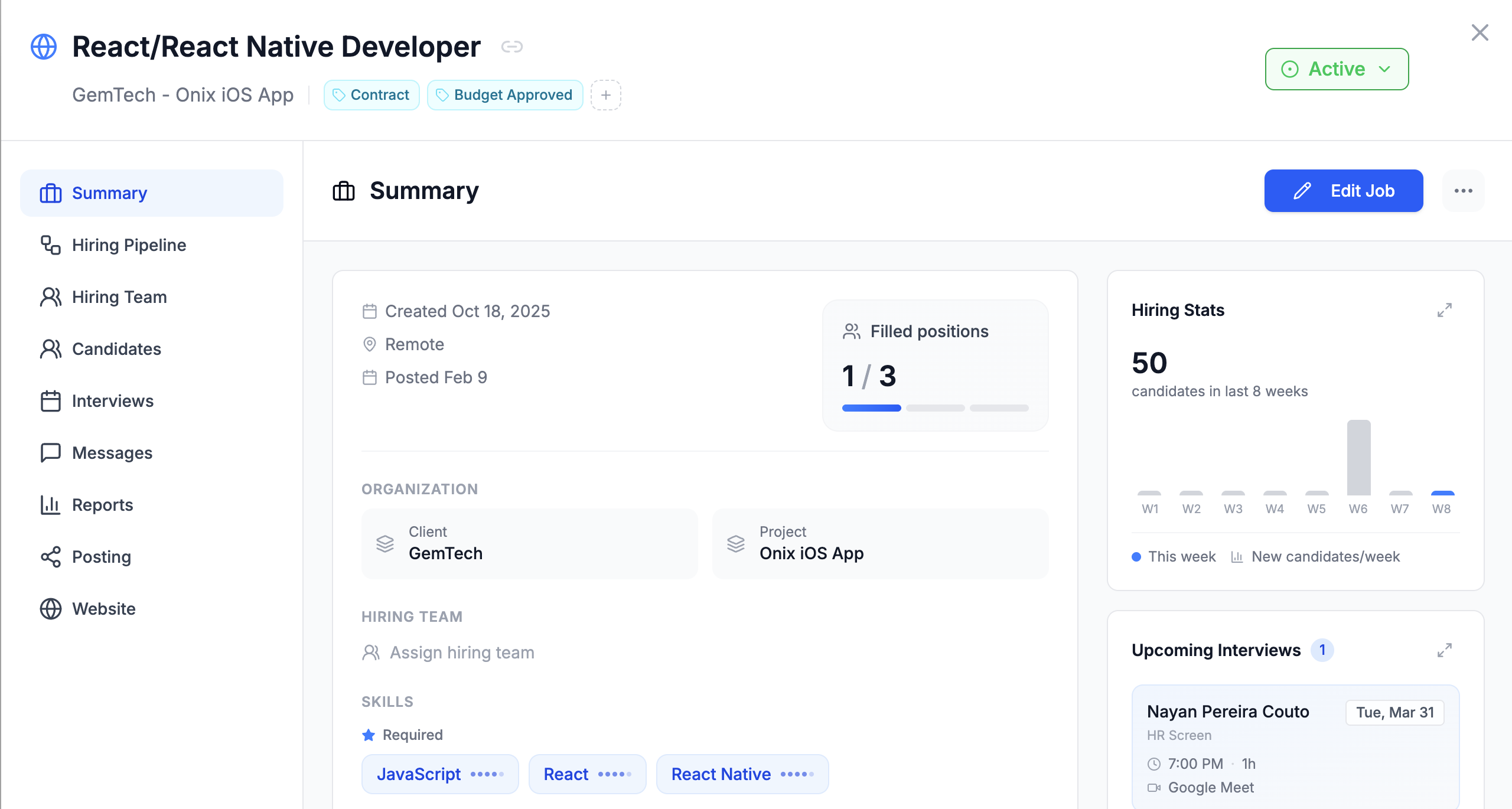 Automatically convert a job description into a detailed job dashboard with all the information you need — from required skills to hiring stats and upcoming interviews.
