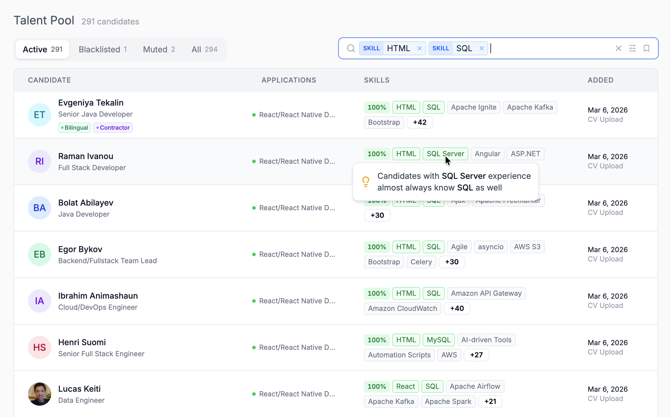 Our SkillsGraph algorithm understands how technologies connect so you can find the right talent, even when candidates describe their skills differently than your search terms.